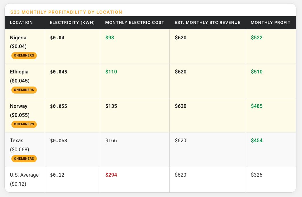 Consider two operators, both running identical Antminer S23 units drawing 3,400 watts each. Both are connected to the same mining pool, both see identical hashrate, and both sell into the same BTC market. The only difference is where their equipment sits. One is hosted in Nigeria at $0.04/kWh. The other is paying the U.S. national average of $0.12/kWh. The monthly electricity cost for one machine is $98 versus $294 — a difference of $196 per unit. Across a 500-machine fleet, that gap becomes $98,000 every single month, or nearly $1.2 million per year in pure cost variance. No hardware optimization closes that gap. No firmware tweak touches it. Only location does.