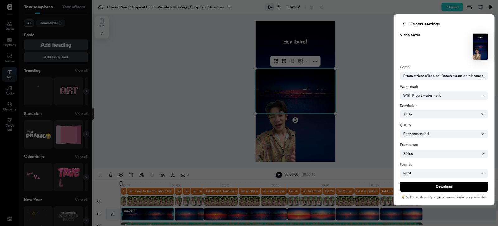 Once satisfied, click “Export” to save your video. Publish instantly on TikTok, Instagram, or Facebook via “Publish”, or download using “Download” with your chosen format, frame rate, resolution, quality, and file name.